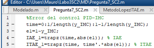Recordemos que como la entrada es escalón unitario, la función en el tiempo de esta lo tomaremos como 1. Por lo tanto, el error es e(t)=1-y(t). Siendo y(t) la función de salida en el dominio del tiempo. Para calcular la integral usaremos la función “trapz”, que sirve para calcular una integral a través del método numérico conocido como trapezoide: